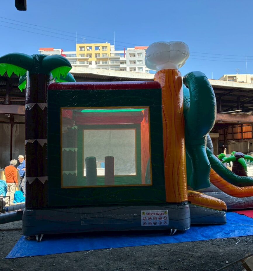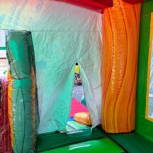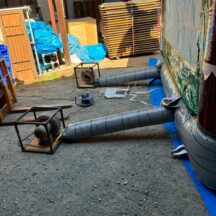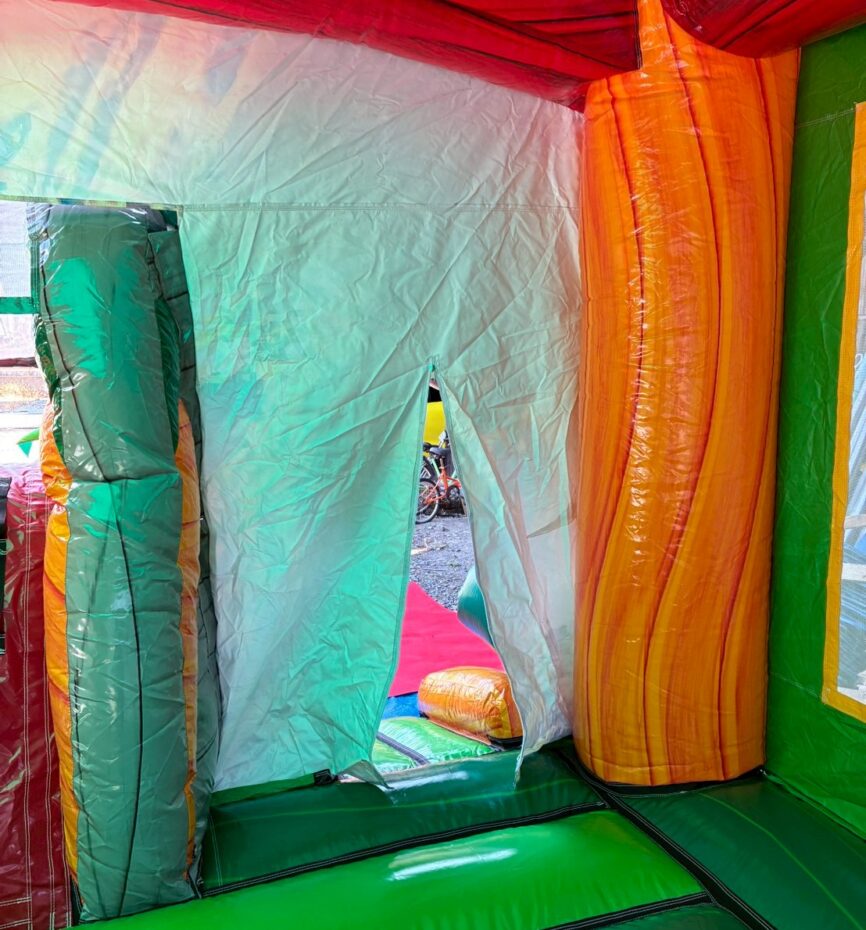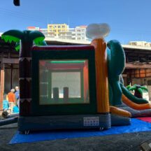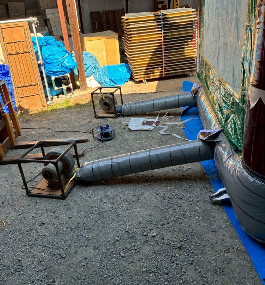 ふわふわの下には地面に直接触れない様にシートを引き、風等であおられることを避けるために重り・杭を刺す必要があります。